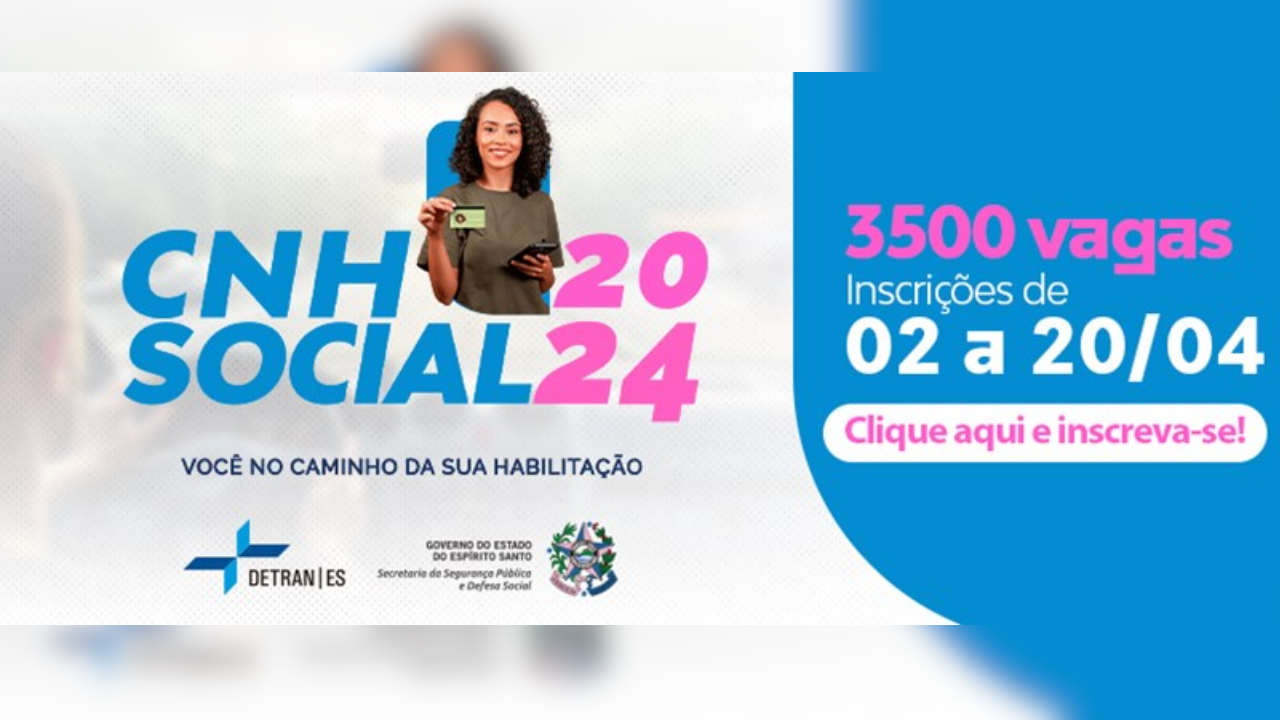 O Departamento Estadual de Trânsito (Detran) do Espírito Santo lançou 7.000 vagas para o Programa CNH Social 2024, que permite a obtenção da carteira de motorista de forma gratuita para os beneficiados. As inscrições devem ser feitas no site do Detran e estarão disponíveis após o lançamento oficial do projeto, que ocorrerá às 10 horas desta terça-feira (02).